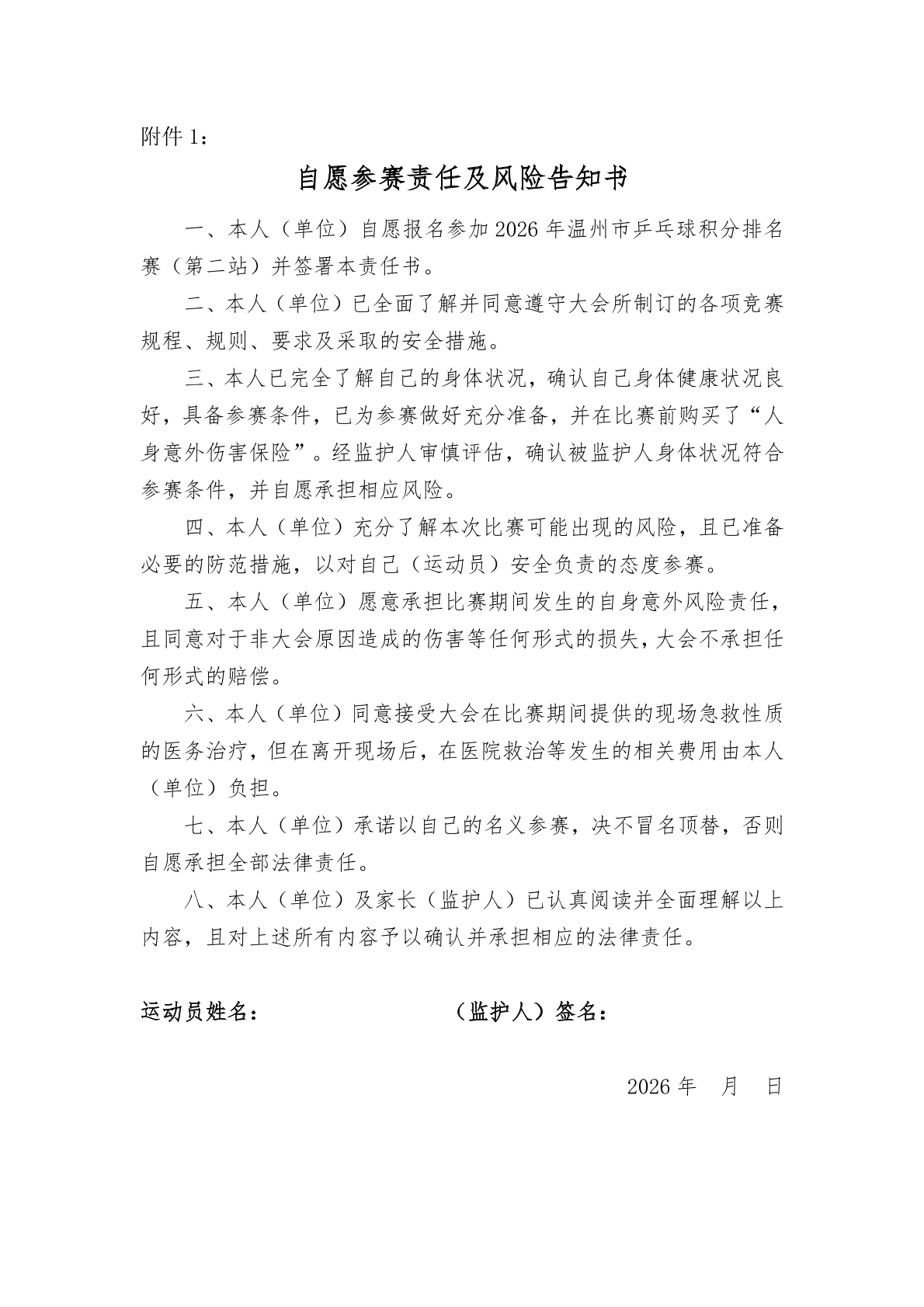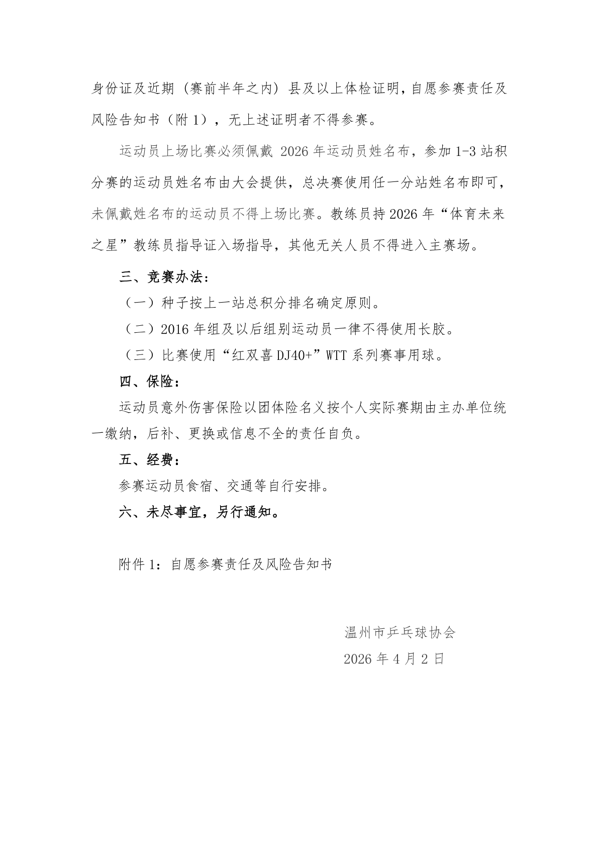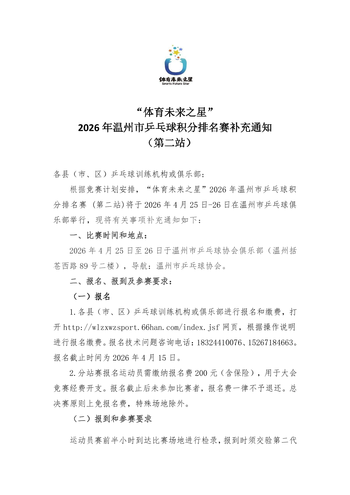 2026年温州市乒乓球积分赛(第二站)补充通知
